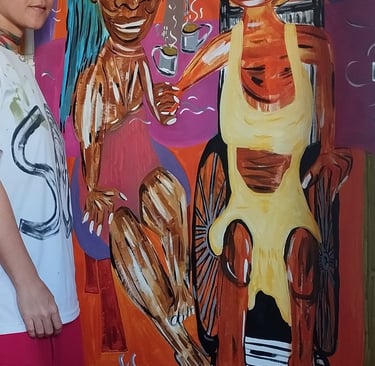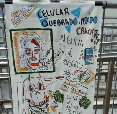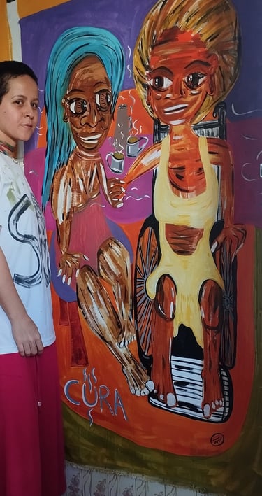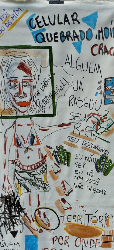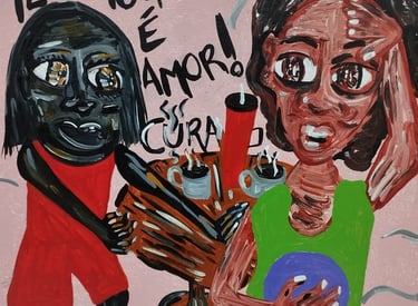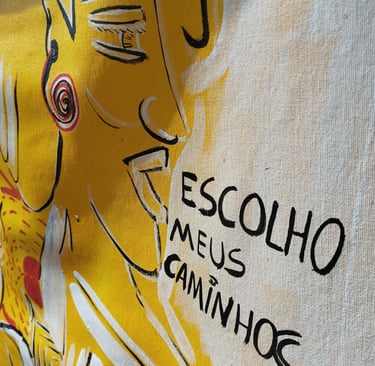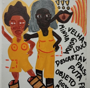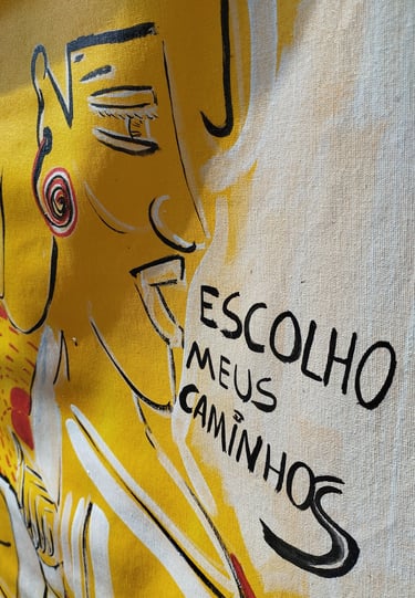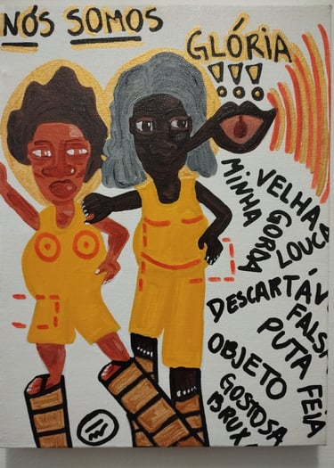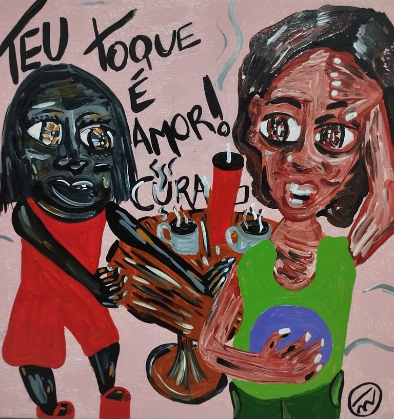 " B.G: Como artista curiosa, pesquiso e crio a partir/entre cruzamentos de fontes, que me fizeram enxergar essa experiencia vida com tanta graça e beleza. Que trouxeram esse local de estado de paz, alegria, amor, celebração, e que só é possível com muitas mãos ao longo dos encontros que pude ter, e cada um desses encontros com BGs diferentes e Brasis diferentes. Então, fui juntando perolas e cicatrizes, todas como tesouros dadas pela bisá( sempre com pano branco na cabeça, com cachimbo, na cadeira de balanço ou batendo perna pela cidade) ou amiga( bell hooks será sempre aquele coração em paginas, que me dá força pra andar pelas ruas com amor, autoamor e muitas ferramentas) ... sabe falar de uma é falar de tantas e com o tempo, vou deixando aqui um pouco das minhas referencias e grandes amigues que sempre caminham comigo. Sou tentacular. Você desse outro lado, gratidão imensa por estar aqui lendo essas palavras. Tem muita coisa na trajetória de cada um e somos imensos, livros de infinitas paginas. Aqui, nessa e em outras plataformas, trago um pouco das coisas que me tocam, que quero ajudar um pouco no mundo, auxiliar alguém, trazer um pouco de alegria, de questionamentos... mas tude, tude mesmo: Espero que você esteja bem e que algo possa elevar sua energia e fazer você ficar melhor. E vai circular no mundo! Nosso lugar é onde a gente quiser!!!!!